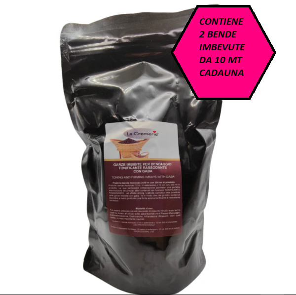 Bendaggio pronto con 2 garze da 10 mt cadauna in estensione, imbibite in 300 ml di prodotto, pronte all’uso per trattamento Tonificante e Rassodante .