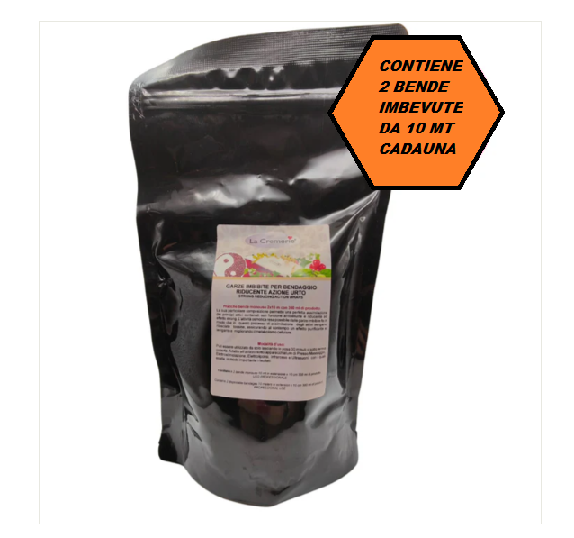 Bendaggio pronto con 2 garze da 10 mt cadauna, imbibite in 300 ml di prodotto, pronte all’uso per trattamento anticellulite ad azione urto .