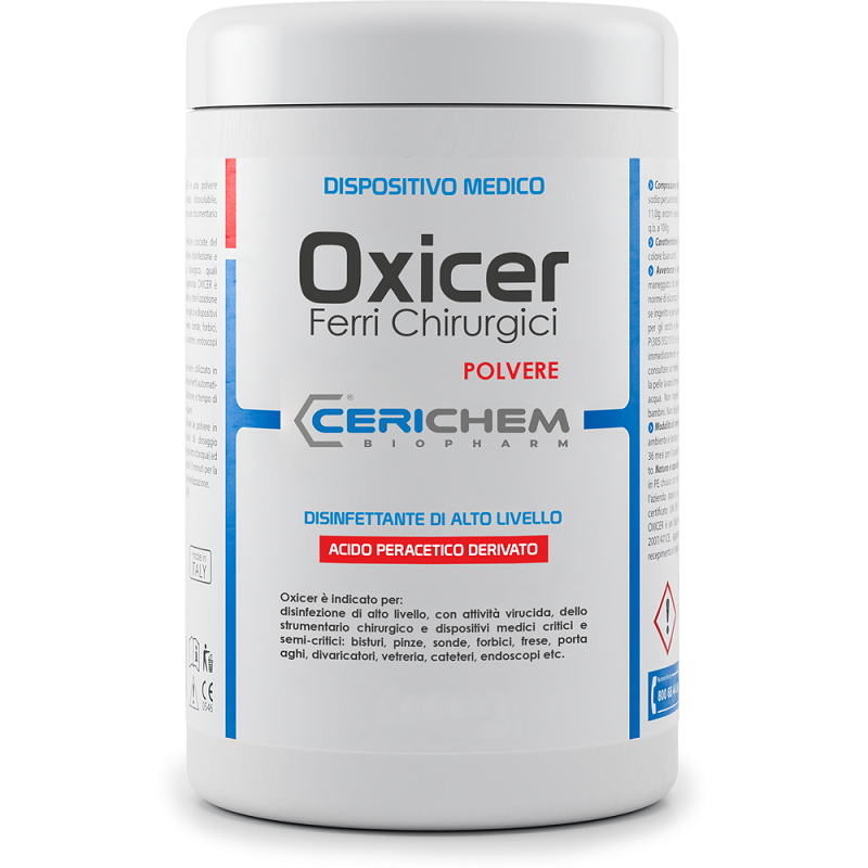 OXICER è una “polvere composta” idrosolubile indicata per la decontaminazione, detersione, disinfezione di alto livello di dispositivi medico-chirurgici in ambito ospedaliero, ambulatori medici ed odontoiatrici.