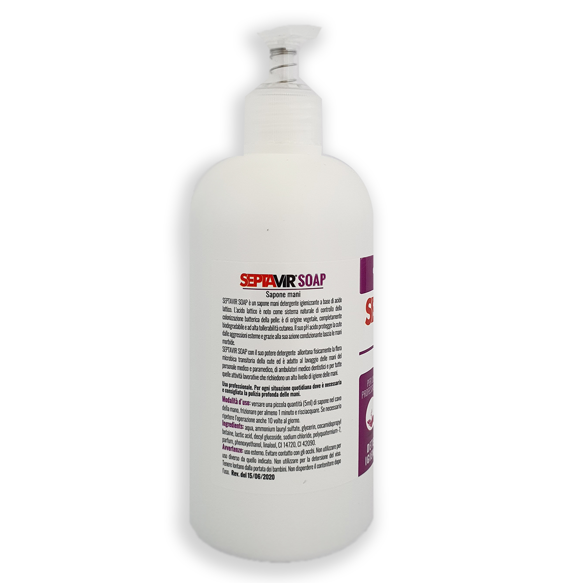 Septavir soap con il suo potere detergente allontana fisicamente la flora microbica transitoria della cute Uso professionale. Per ogni situazione quotidiana dove è necessaria e consigliata la pulizia profonda delle mani. Septavir soap è un sapone mani detergente igienizzante a base di acido lattico. L’acido lattico è noto come sistema naturale di controllo della colonizzazione batterica della pelle; è di origine vegetale, completamente biodegradabile e ad alta tollerabilità cutanea.