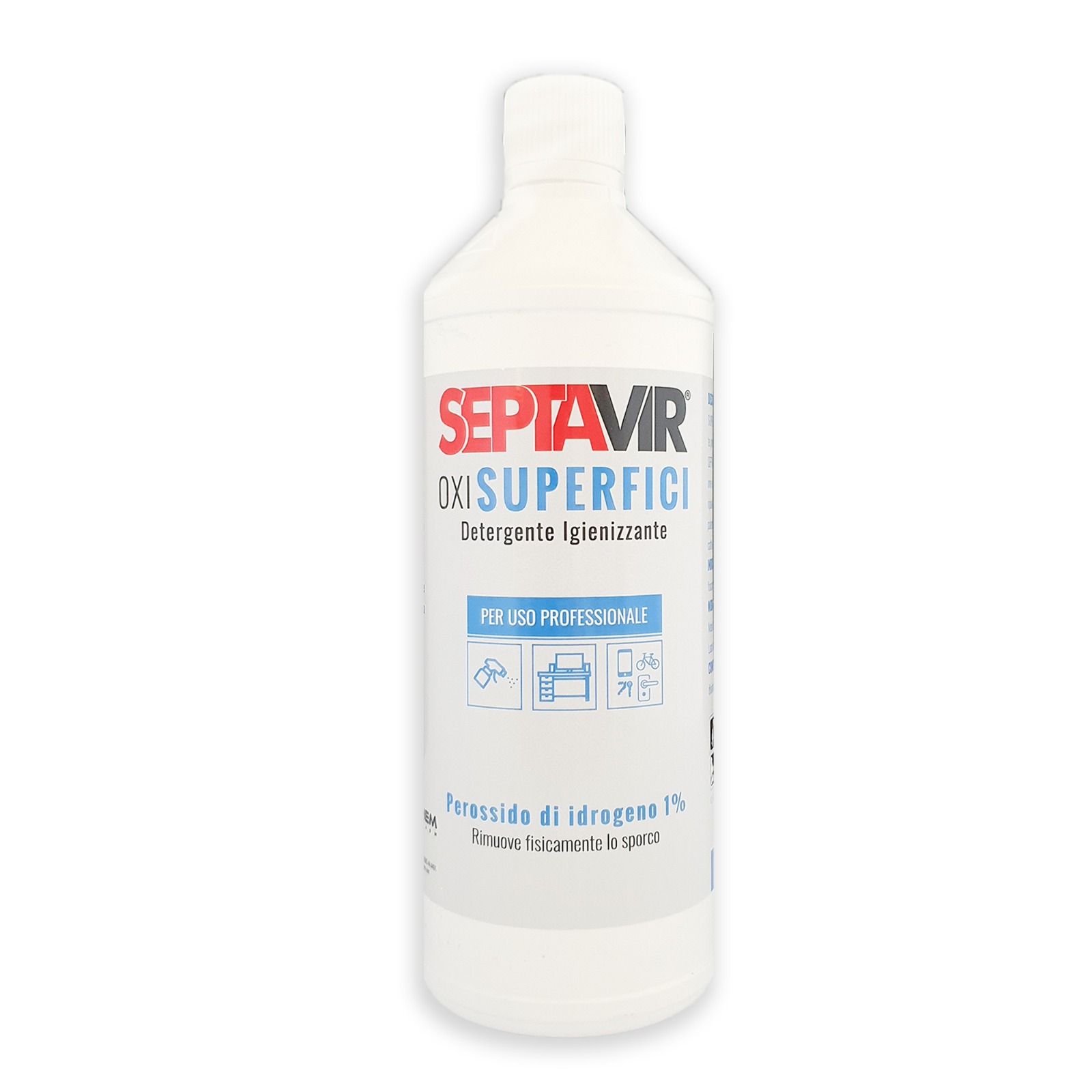 • SEPTAVIR Soluzione liquida igienizzante pronta all'uso da 1l per tutte le superfici, a base di perossido di idrogeno all'1%, trasparente e incolore.