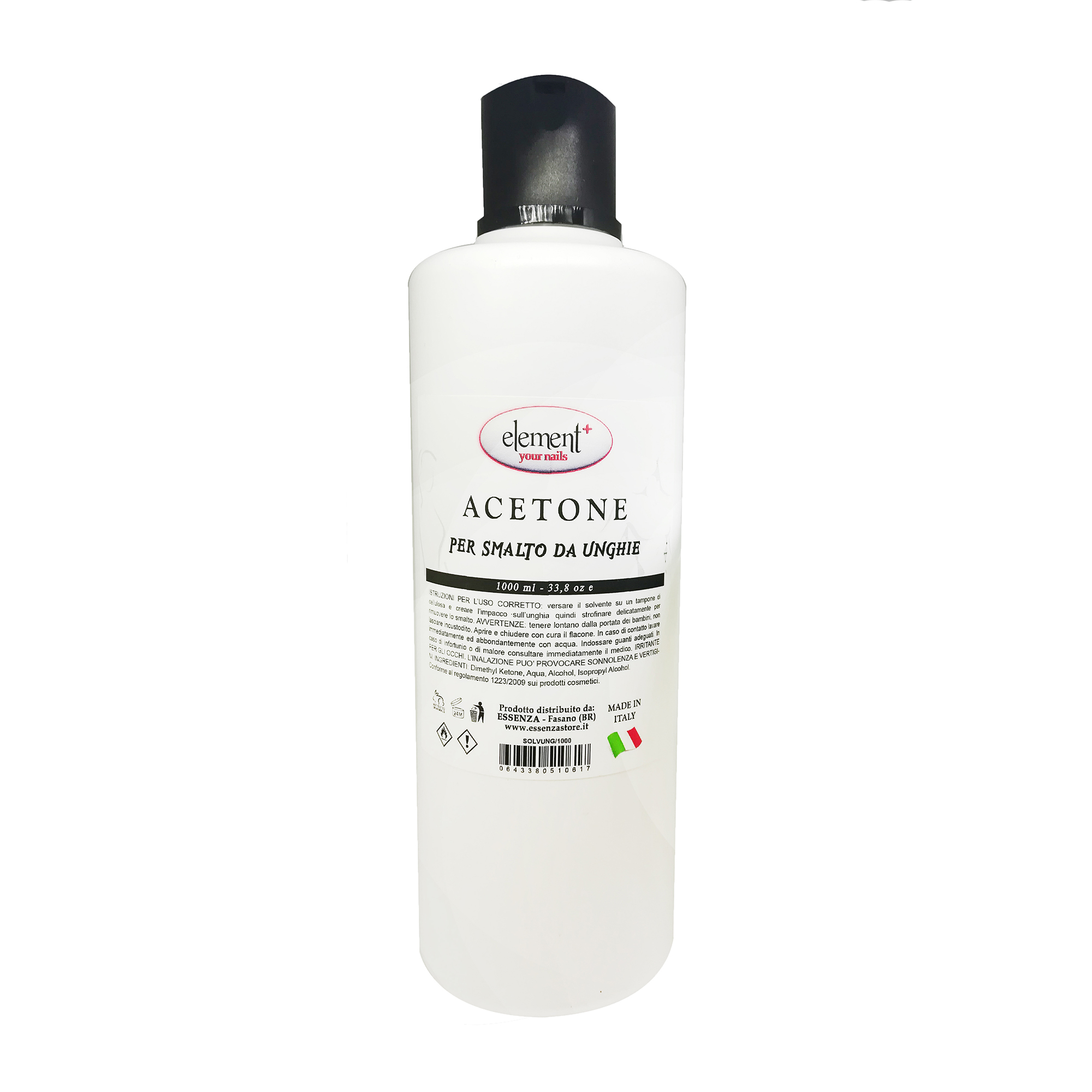 AVVERTENZE: tenere lontano dalla portata dei bambini, non lasciare il prodotto incustodito. Aprire e richiudere con cura il flacone. In caso di contatto accidentale lavare immediatamente la parte interessata con abbondante acqua. Indossare guanti adeguati. In caso di infortunio o malore consultare il medico. INGREDIENTI: Dimethyl Ketone, Aqua, Alcohol, Isopropyl Alcohol. Questo prodotto è conforme al regolamento 1223/2009 sui prodotti cosmetici. FLACONE 1000 ml